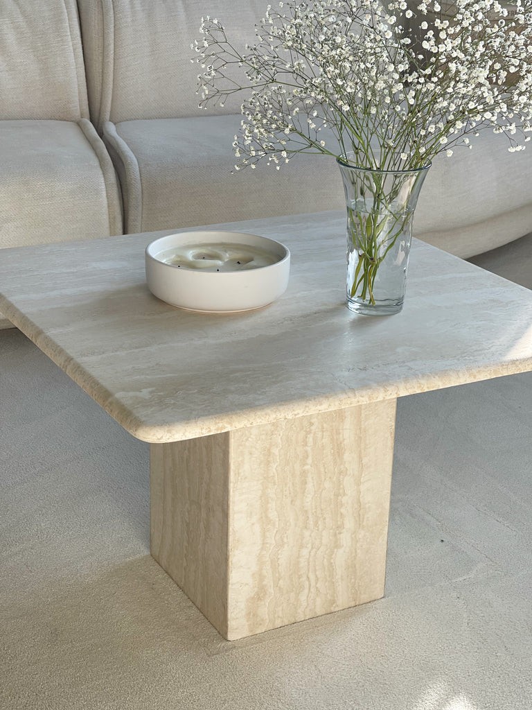 A small yet divine coffee table for any city space. Oftentimes our smaller styles come in a polished finish, however this was given a fresh new honed (also known as matte) finish. This table uses a light travertine variation which is neutral and muted, pairing well with any colour family. Introducing a natural stone to your home, not only elevates your living space, but holds lifetime value. Stone has been desirable for centuries.