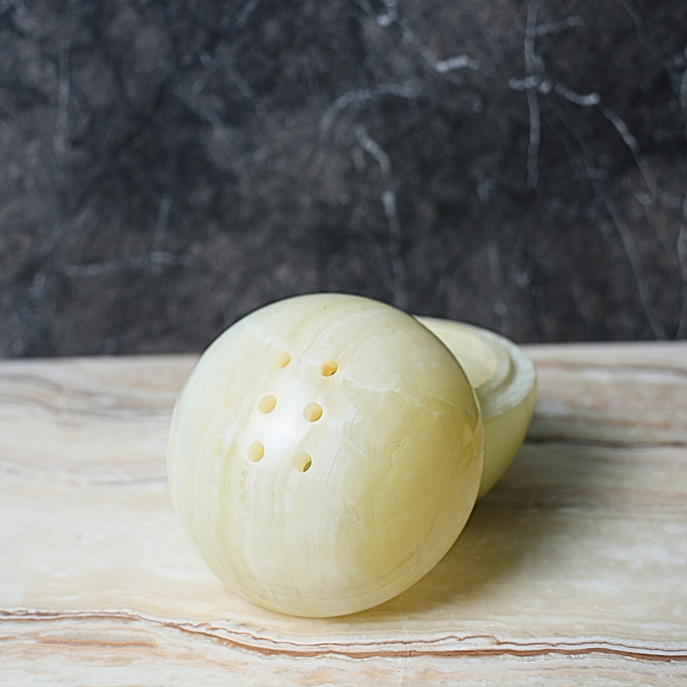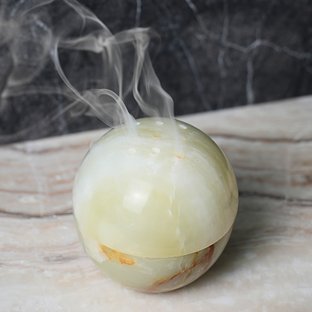 Carved from solid Onyx , the Incense Burner features a reversible design so the owner can customize to their desired sculptural preference. The design is stable as 2 opposed half spheres resting together, or as a complete sphere. It is suitable for all types of incense.