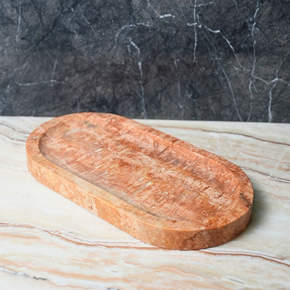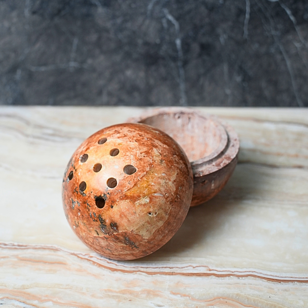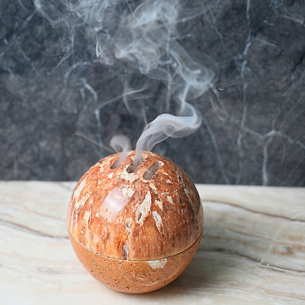 Carved from solid Red Shine Travertine , the Incense Burner features a reversible design so the owner can customize to their desired sculptural preference. The design is stable as 2 opposed half spheres resting together, or as a complete sphere. It is suitable for all types of incense.