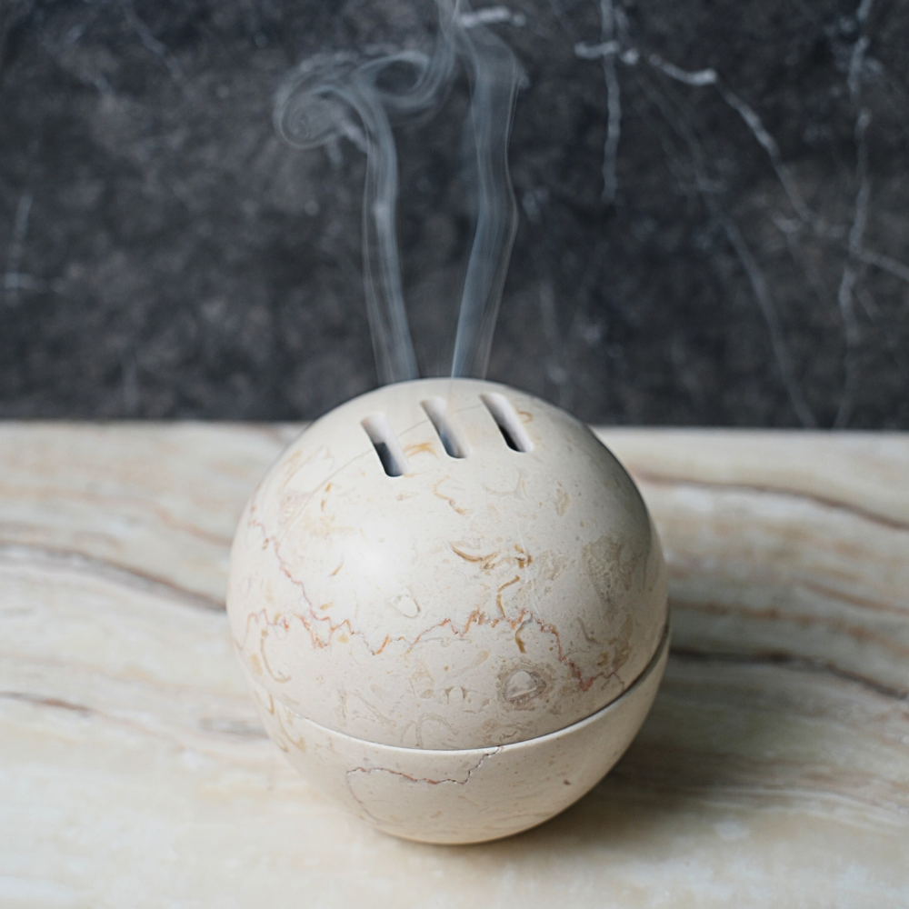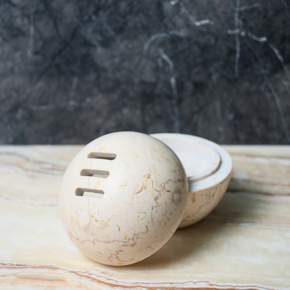 Carved from solid beige Rosa , the Incense Burner features a reversible design so the owner can customize to their desired sculptural preference. The design is stable as 2 opposed half spheres resting together, or as a complete sphere. It is suitable for all types of incense.