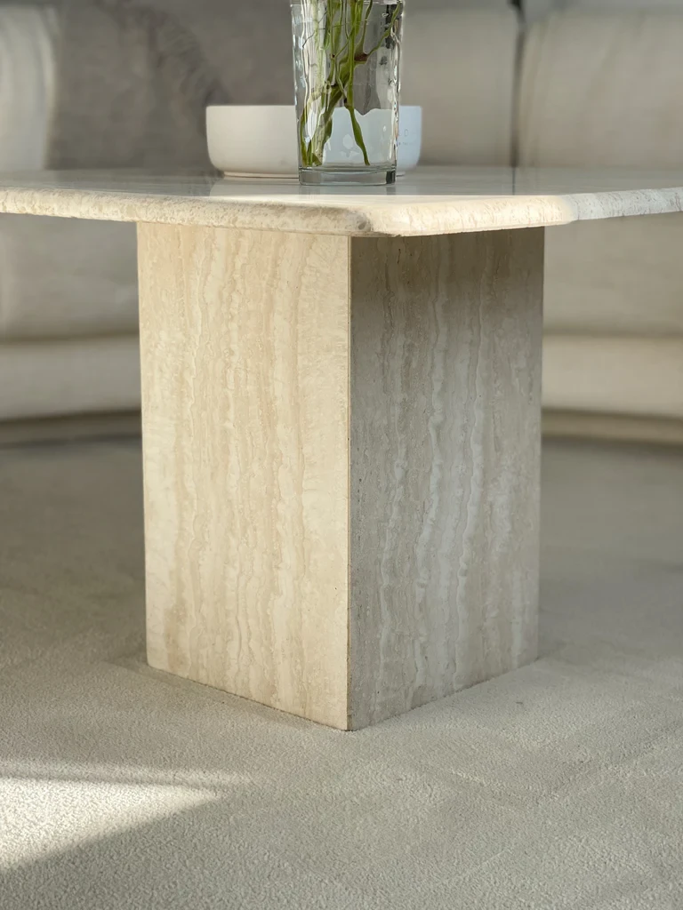 A small yet divine coffee table for any city space. Oftentimes our smaller styles come in a polished finish, however this was given a fresh new honed (also known as matte) finish. This table uses a light travertine variation which is neutral and muted, pairing well with any colour family. Introducing a natural stone to your home, not only elevates your living space, but holds lifetime value. Stone has been desirable for centuries.