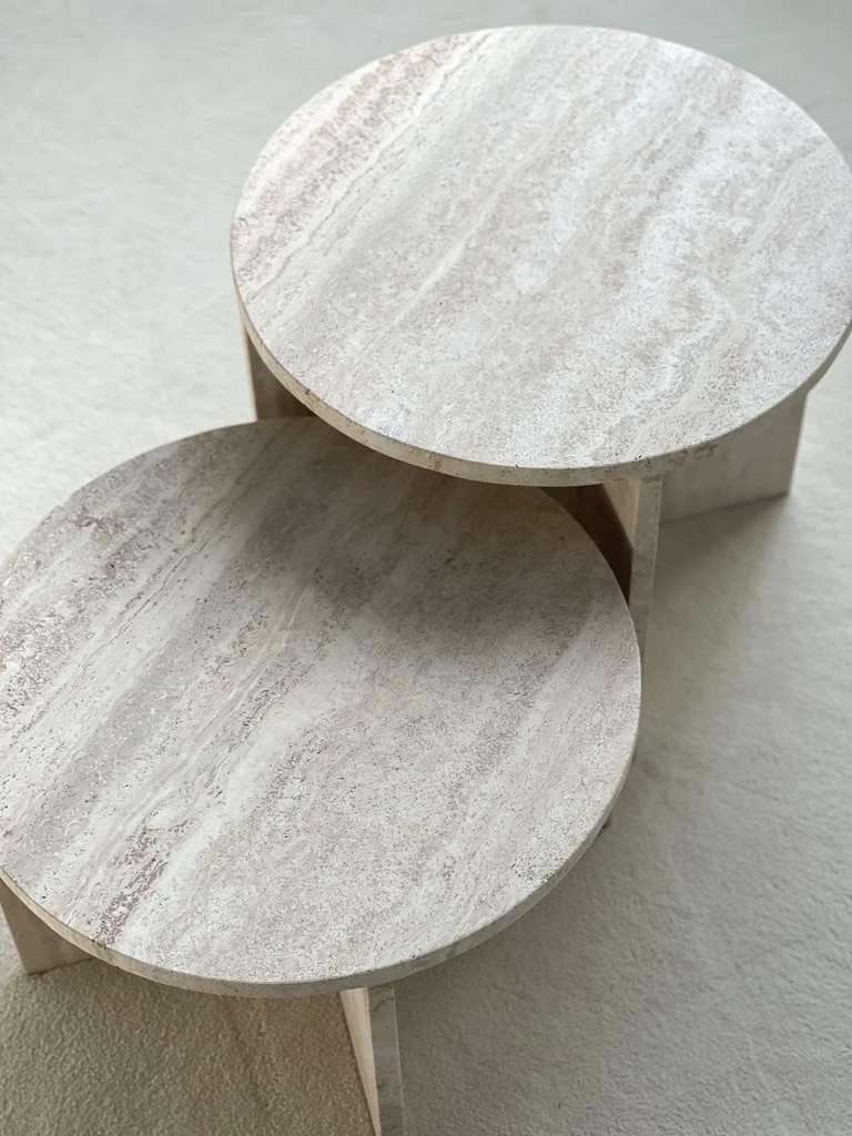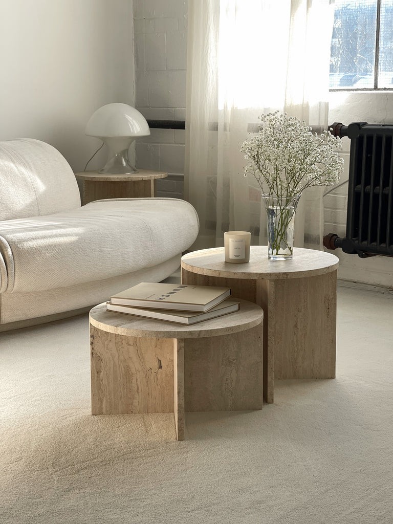 A small yet divine coffee table for any city space. Oftentimes our smaller styles come in a polished finish, however this was given a fresh new honed (also known as matte) finish. This table uses a light travertine variation which is neutral and muted, pairing well with any colour family. Introducing a natural stone to your home, not only elevates your living space, but holds lifetime value. Stone has been desirable for centuries.